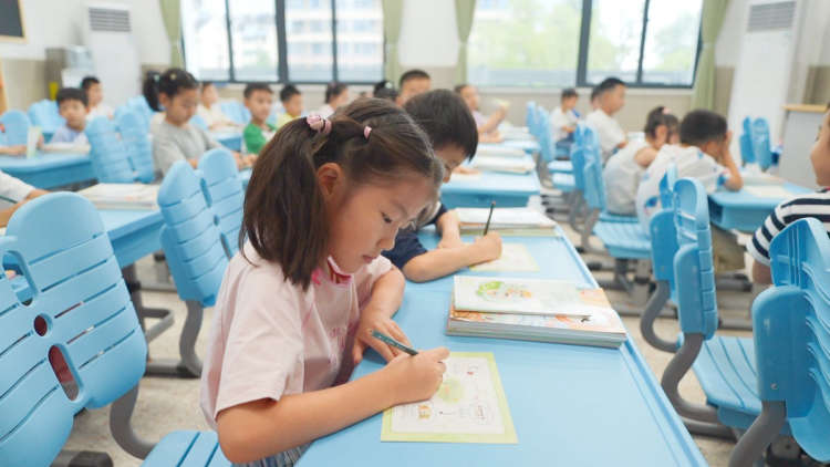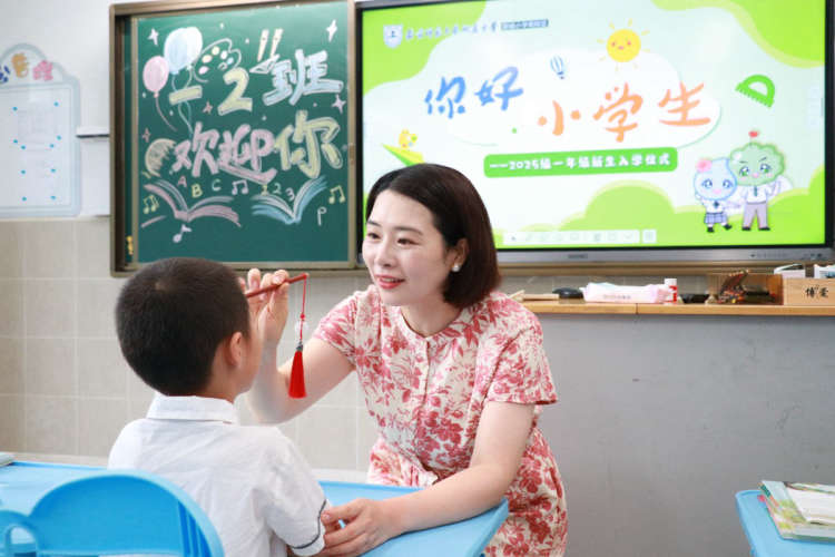 回到班级中,班主任引导孩子们拿出“入学通关卡”,在田字格上书写“人”字。简单的两笔,却蕴含着“为人立身,为人立志”的深意。孩子们握着铅笔,一笔一划认真书写,稚嫩的笔迹里满是对“做人”的懵懂探索与对知识的无限渴望。的童声宣告着他们正式踏入小学的成长新阶,为这场入学仪式画上了圆满的句号。