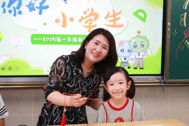 随后,孩子们在家长的陪伴下走进班级,迎来充满仪式感的“朱砂启智”环节。南师附中新城小学南校区党支部书记、校长叶微,副校长魏婕、耿志燕、姜甫与班主任老师一同为 “小萌新”们点朱砂。老师们手持毛笔,为孩子们在额头正中点上红痣。这朱砂如灵动的智慧种子,在孩子们眉心悄然扎根,寄托着学校对新生们“开启智慧、眼明心亮”的殷切期望。在红色印记的映照下,孩子们的眼眸里闪烁着对校园生活的憧憬,正式开启小学学习的启蒙篇章。