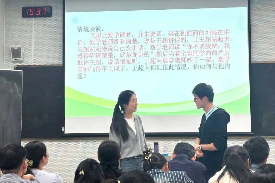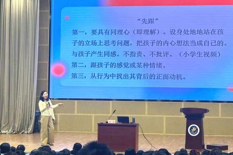 紧接着,苏华老师又为初一初二全体家长开展了一场主题为“亲子沟通密码:打开青春期心门”的讲座。青春期是孩子生理和心理发展的关键时期,家长常常面临与孩子沟通不畅的困惑。苏华老师从心理学角度出发,详细解读了青春期孩子的心理特点和行为表现,并为家长们提供了实用的亲子沟通技巧,如倾听、尊重、理解、引导等。她指出,家长要关注孩子的情绪变化,学会换位思考,用爱和耐心去陪伴孩子成长。讲座中,部分家长上台与专家进行情景演绎、现场互动。许多家长表示,通过讲座找到了与孩子沟通的正确方式,对今后的家庭教育充满信心。