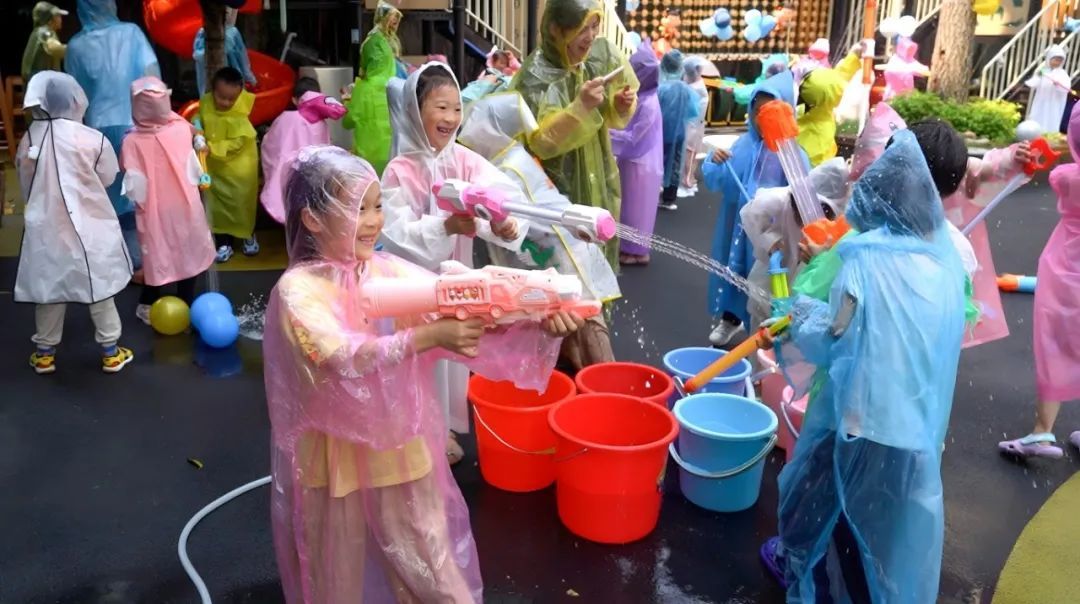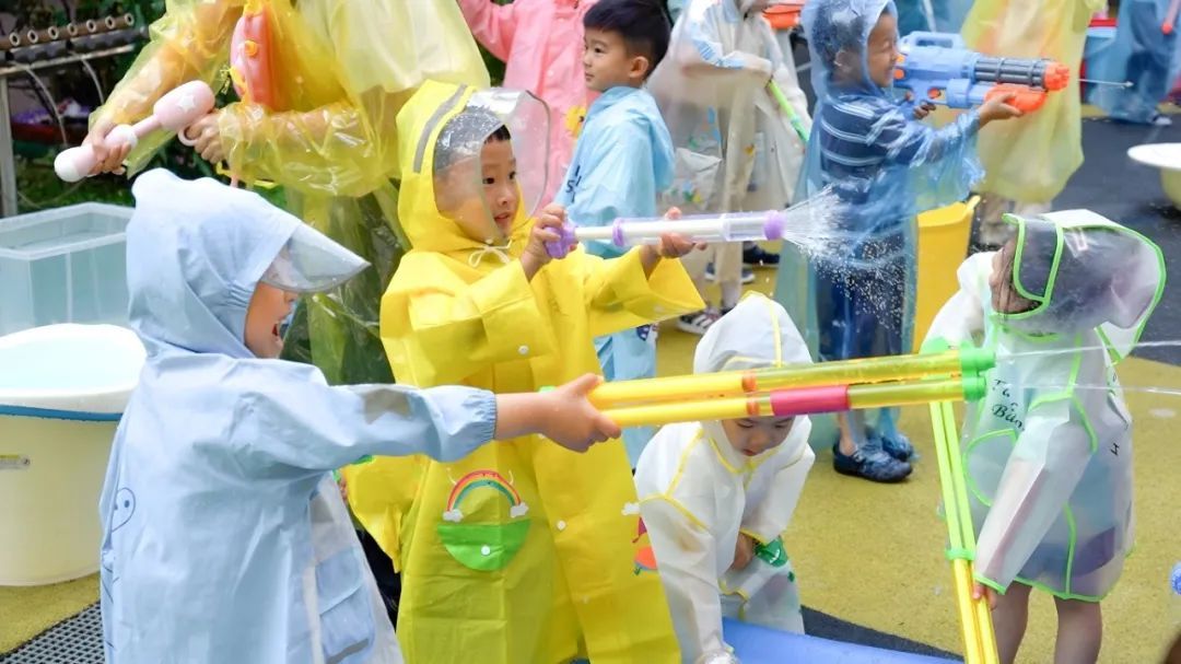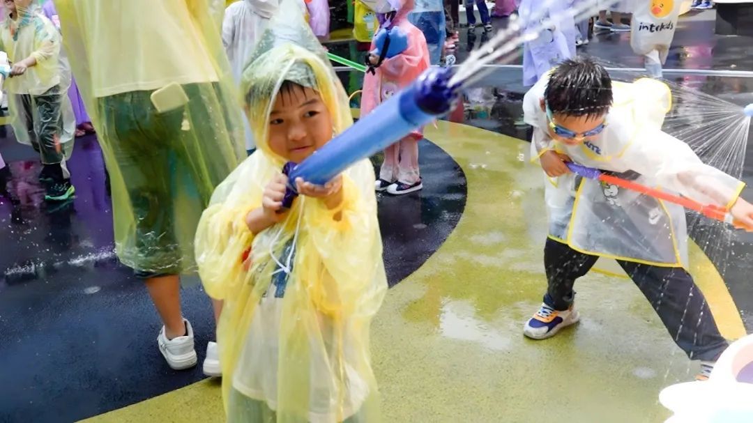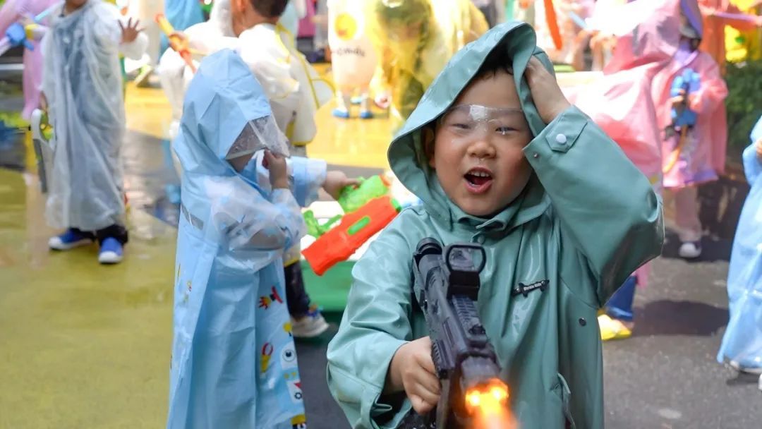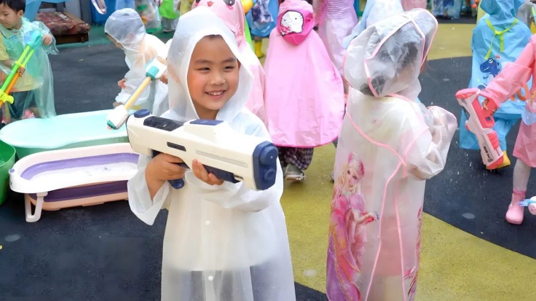 操场中央,几个孩子围成一圈,用水枪灌满清水,对着天空扬起一道道水柱。有的孩子猫着腰躲在积水桶后,偷偷瞄准小伙伴,“嗖”地射出一道水线。阳光下飞溅的水花映照着孩子们的笑脸,整个幼儿园变成了欢乐的海洋。