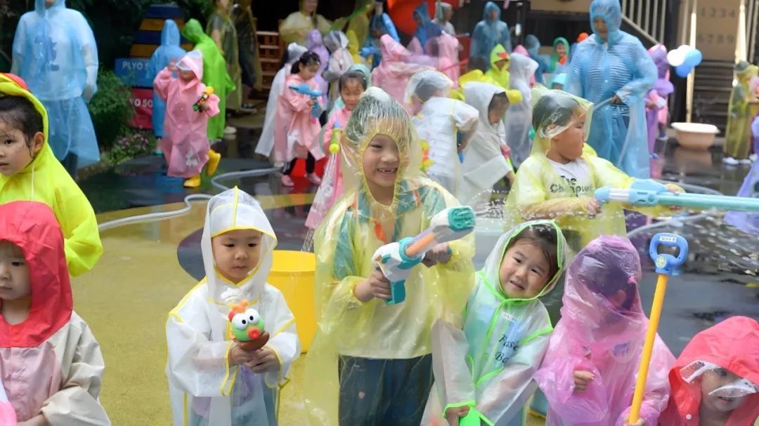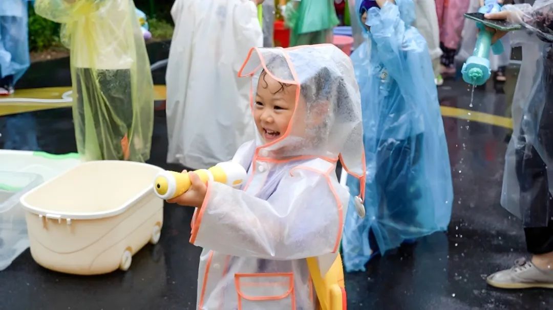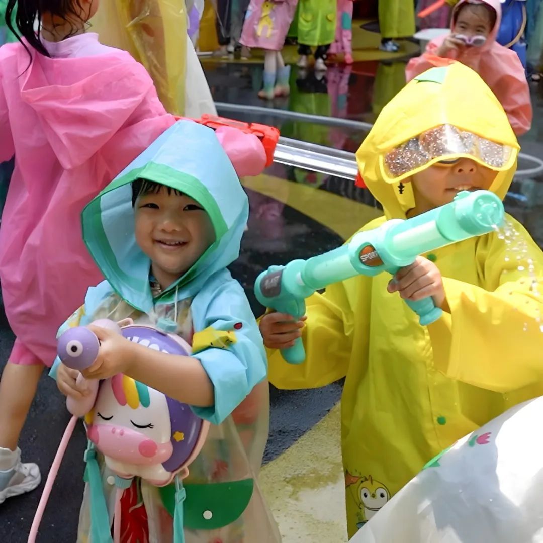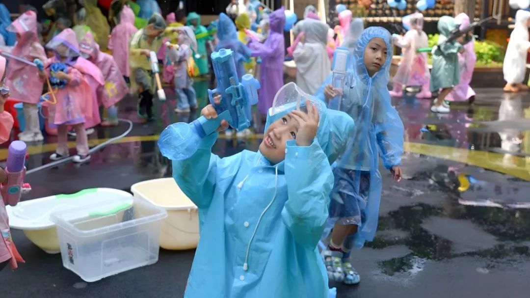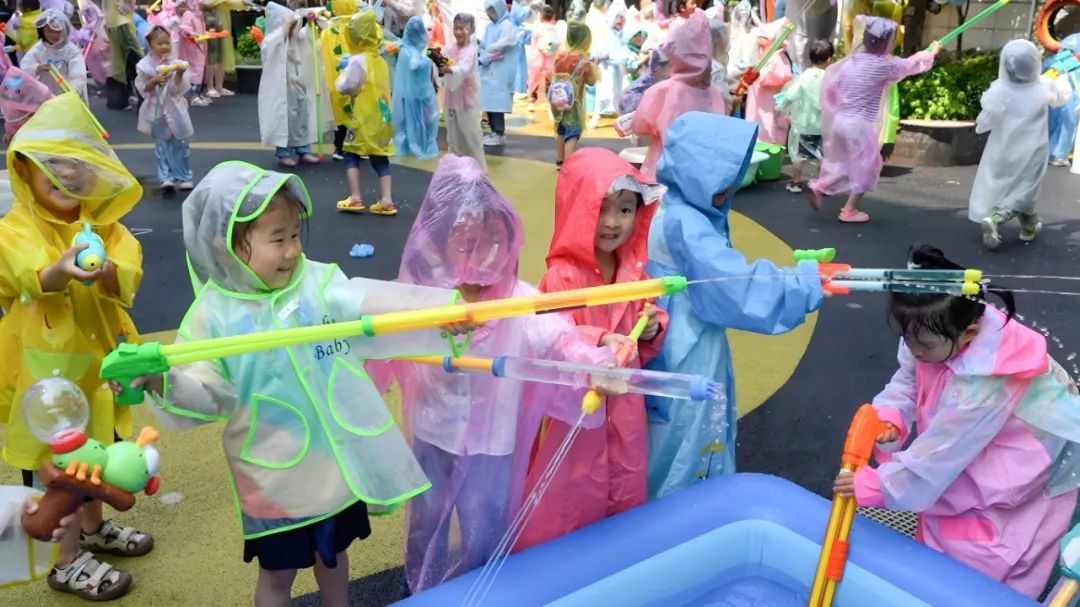 操场中央,几个孩子围成一圈,用水枪灌满清水,对着天空扬起一道道水柱。有的孩子猫着腰躲在积水桶后,偷偷瞄准小伙伴,“嗖”地射出一道水线。阳光下飞溅的水花映照着孩子们的笑脸,整个幼儿园变成了欢乐的海洋。