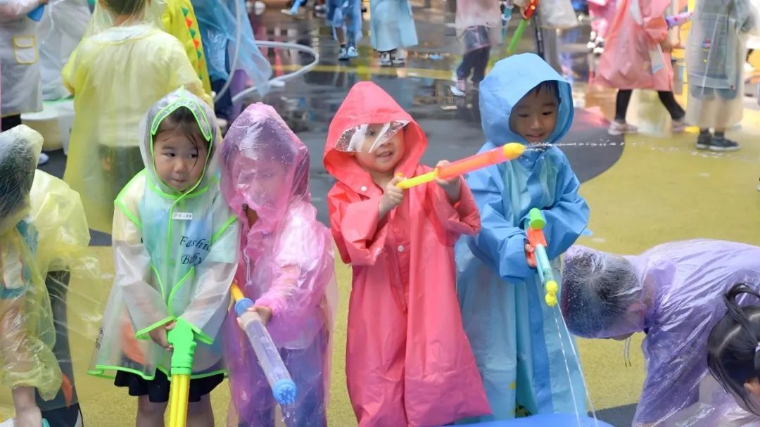 最让孩子们兴奋的是“水世界”游戏环节。幼儿园精心设置了多个玩水区域,水桶、水枪等装备一应俱全。孩子们三五成群,手持水枪,在水的世界里尽情嬉戏。