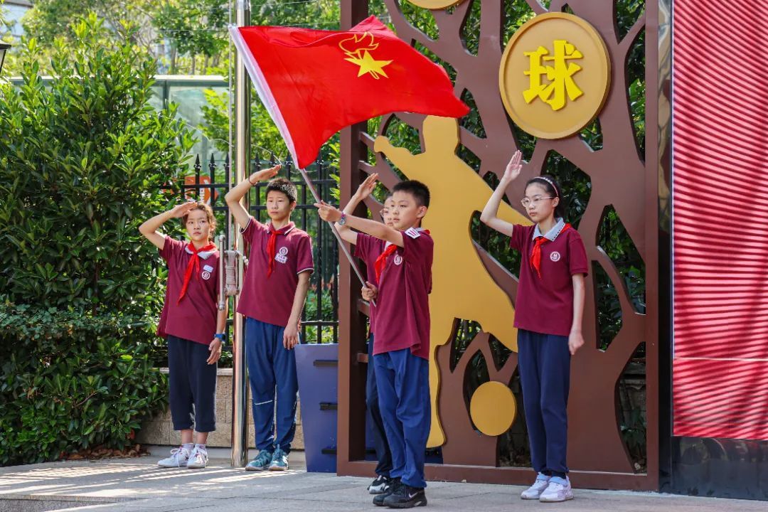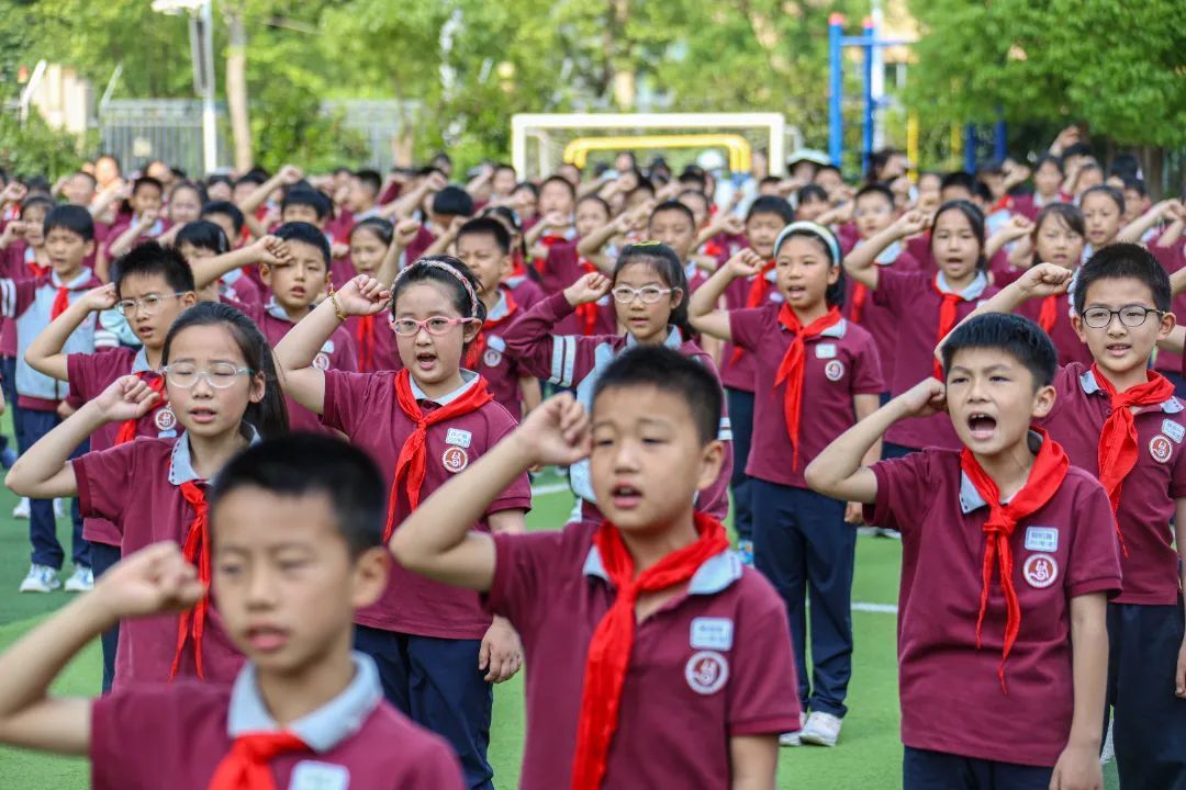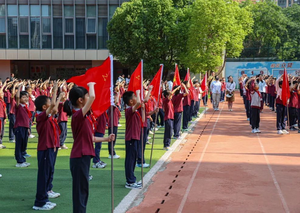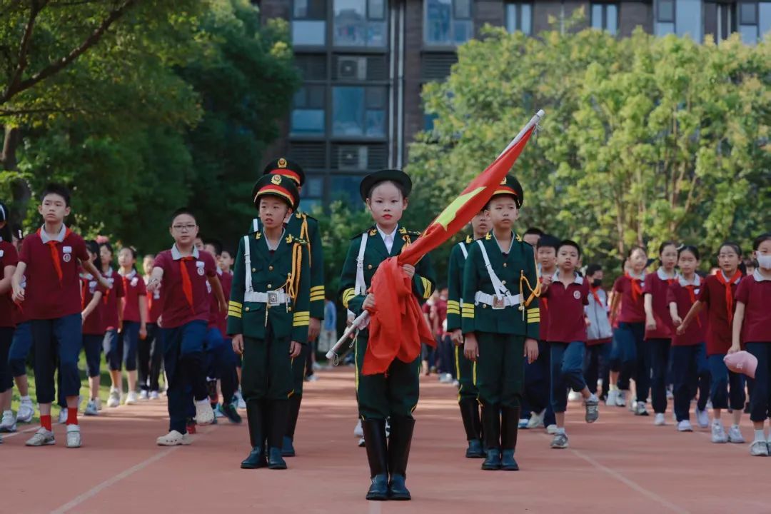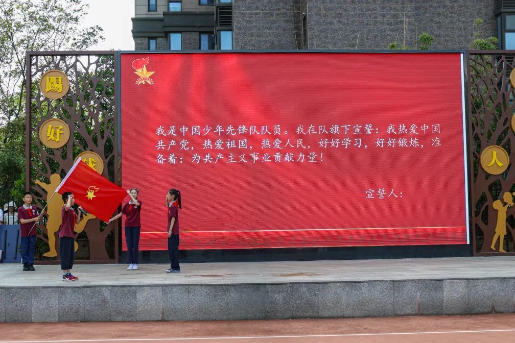 伴随着激昂的出旗曲,少先队旗手迈着坚定的步伐入场,全场高唱中国少年先锋队队歌《我们是共产主义接班人》,嘹亮的歌声在校园回荡,展现了新时代少先队员的精神风貌。