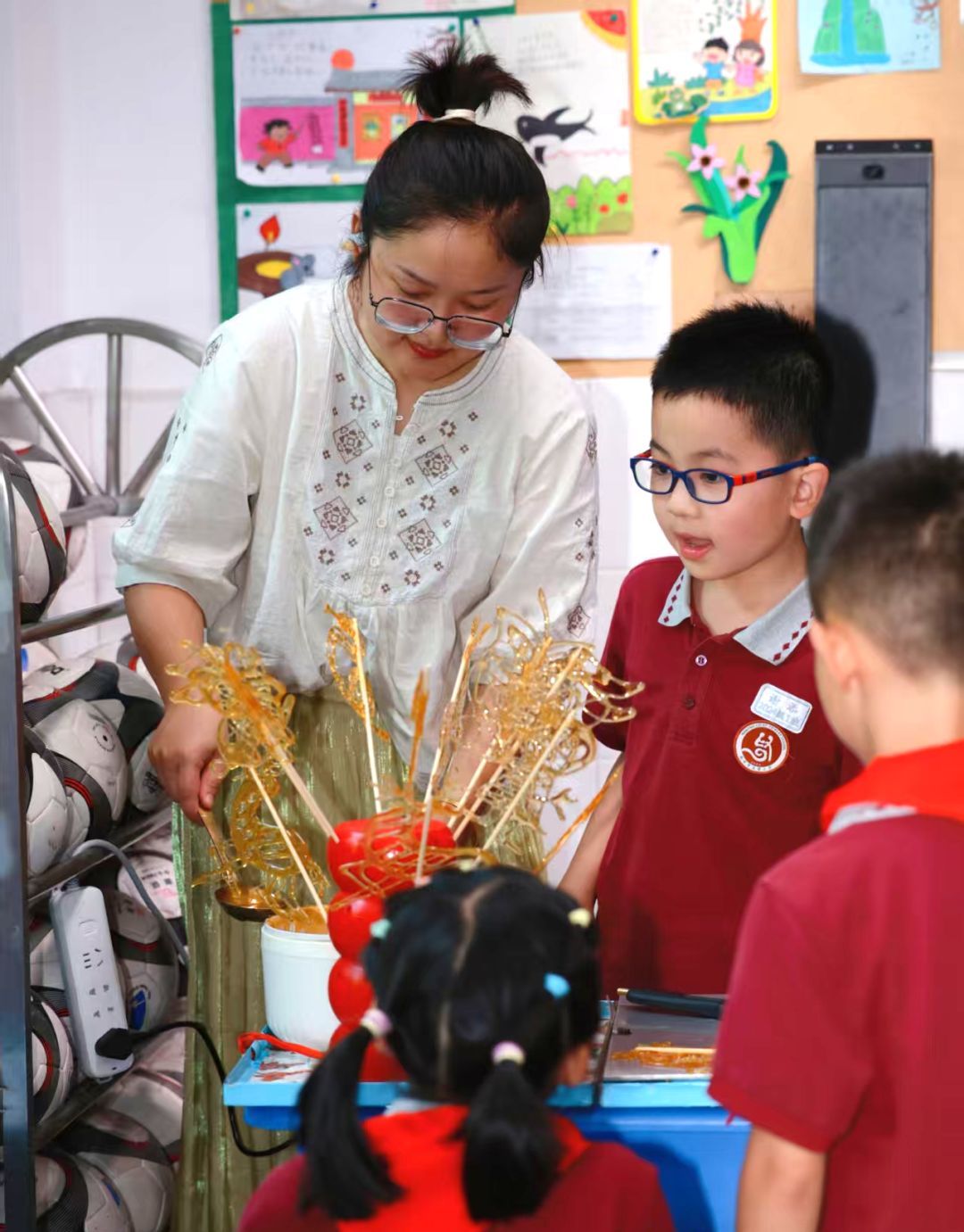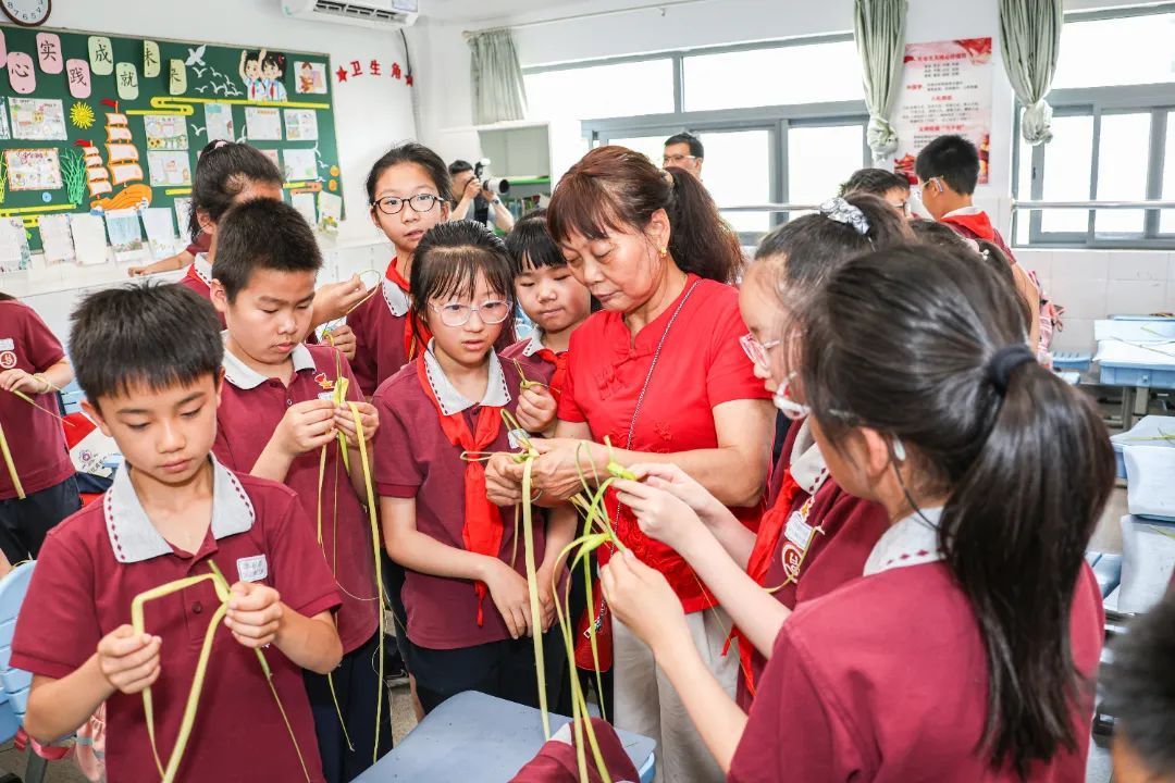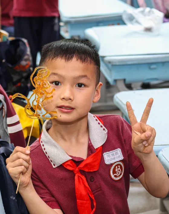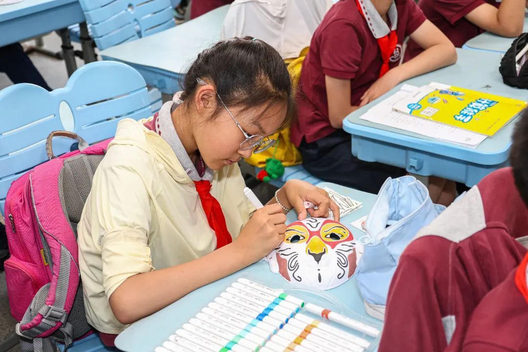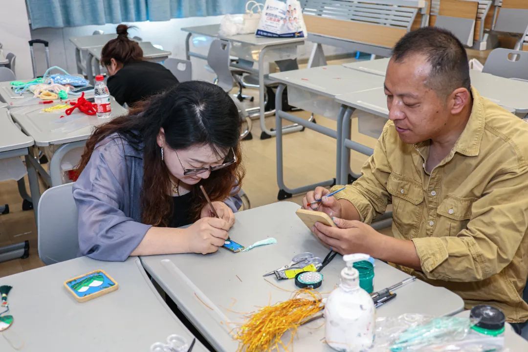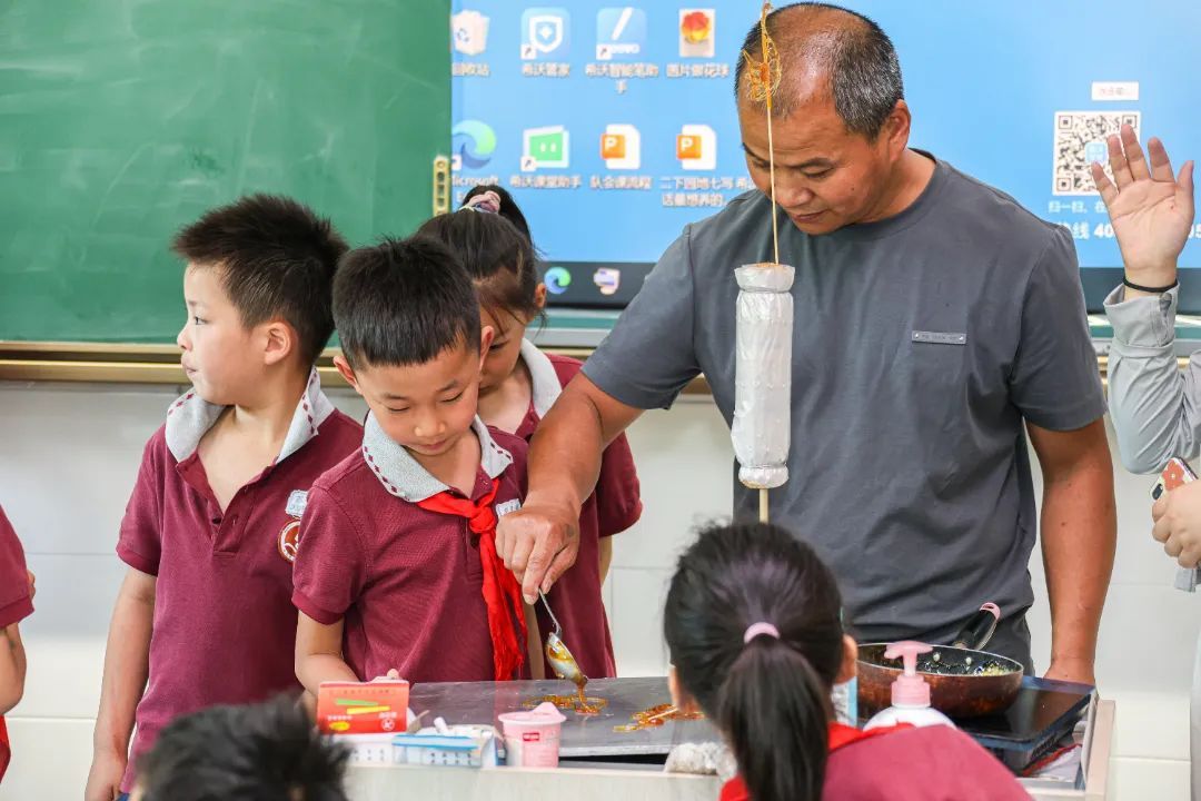 糖画课堂上,铜勺在石板上舞动,金黄的糖浆转眼化作栩栩如生的飞禽走兽;脸谱绘制课堂上,同学们精心勾勒,一张张或威武或诙谐的脸谱跃然纸上;草编大师手把手教授编织技法,棕榈叶在指尖翻飞,不一会儿就变成了活灵活现的蚂蚱、蜻蜓;漆扇课堂上,在老师的指导下,一把把流光溢彩的漆扇渐次成型;面塑课上,五色面团在掌心揉捏塑形,憨态可掬的动物与惟妙惟肖的戏曲人物纷纷诞生。通过动手实践,同学们不仅感受到了传统非遗技艺的独特魅力,更在心中播下了传承和弘扬中华优秀传统文化的种子。