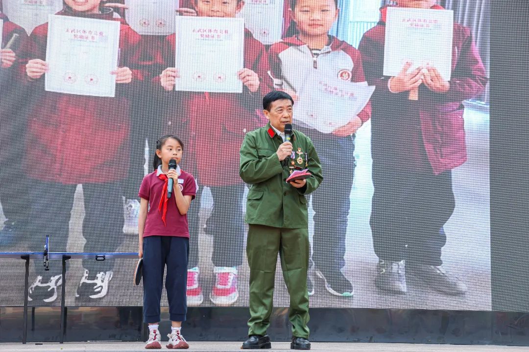王希妍同学与退伍老兵刘洪山带来主题演讲《小球转动大爱 红心接力未来——军装绿与红领巾》,从一位老兵的球台,到一条红领巾的承诺,以一场跨越六十载的对话,激励同学们不仅要“接好球”,传承革命精神,更要“发好球”,展现新时代少年的昂扬姿态,让红色基因永续传承。