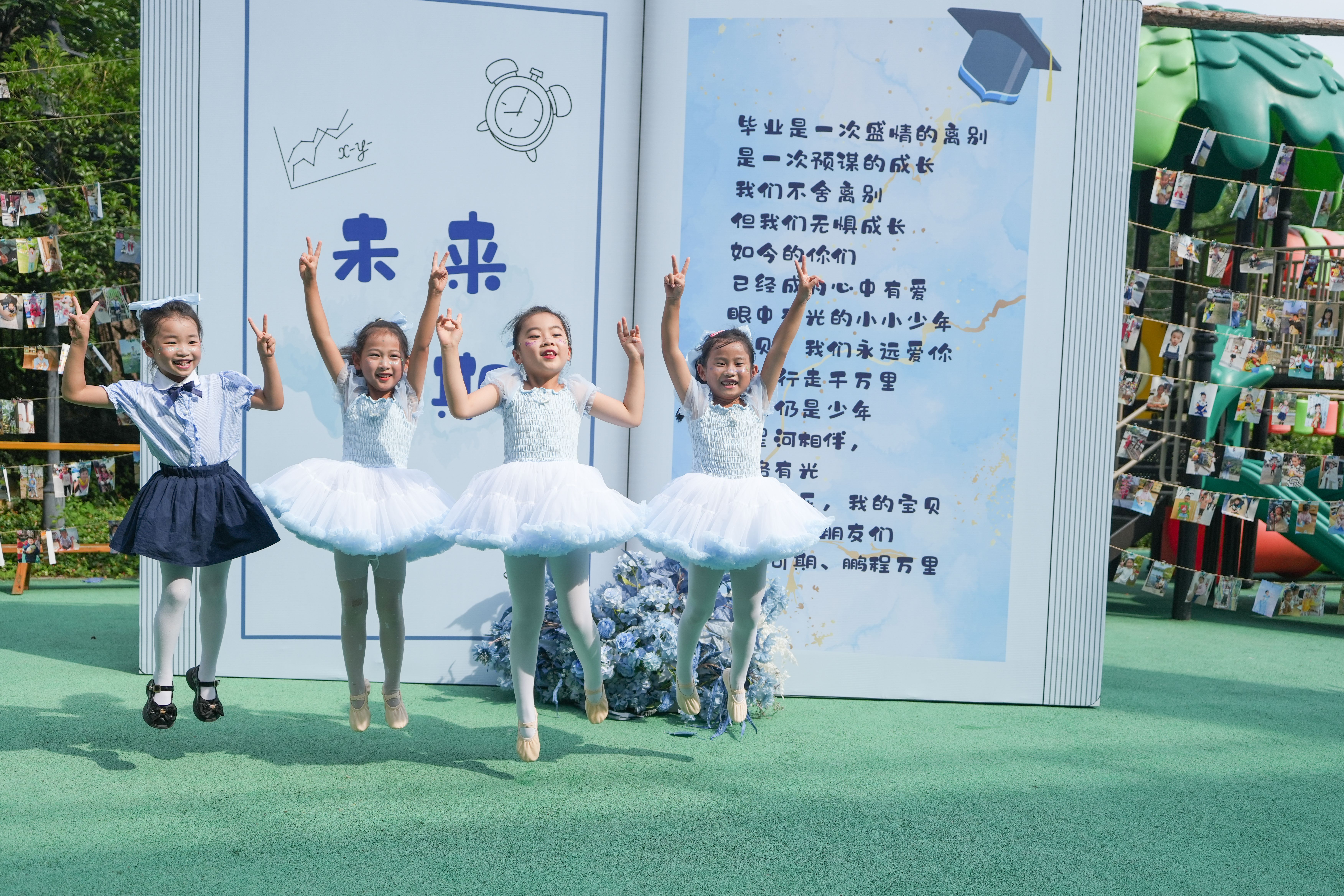 “时间时间像飞鸟,滴答滴答向前跑...”全体幼儿齐唱《毕业诗》和《毕业歌》轻灵的歌声与朗诵声交织,诉说对幼儿园生活的不舍,用声音留存这份珍贵回忆。