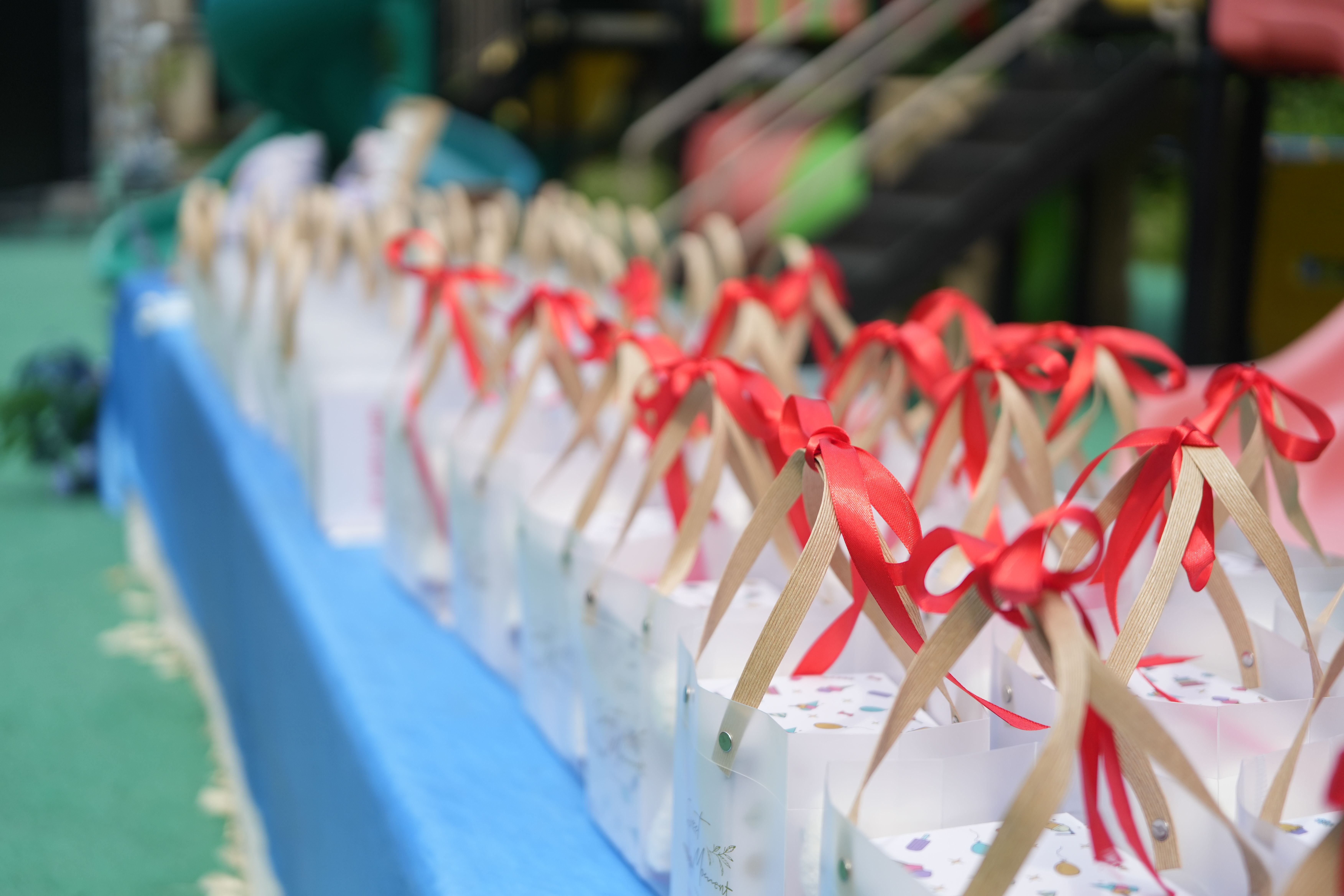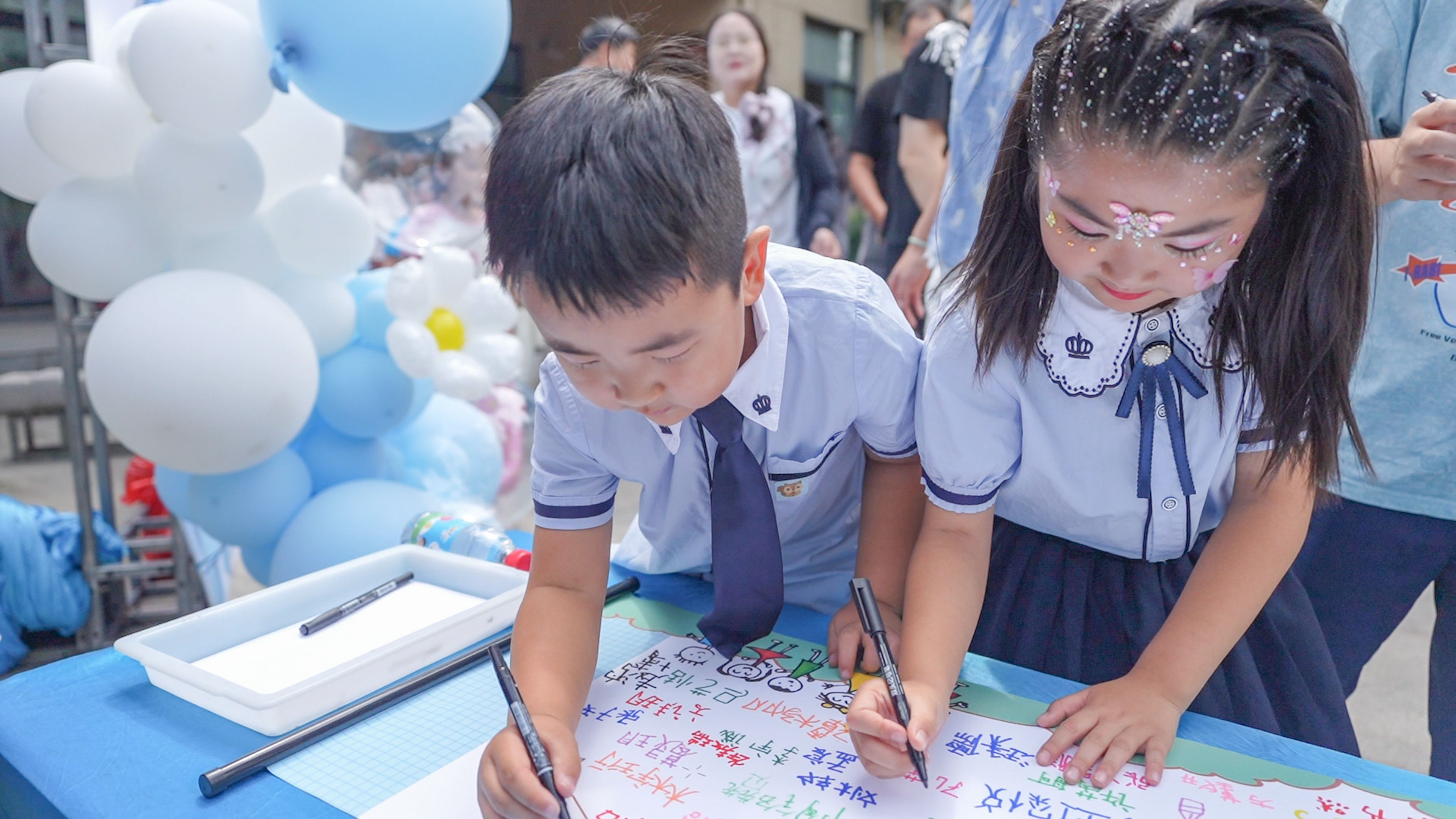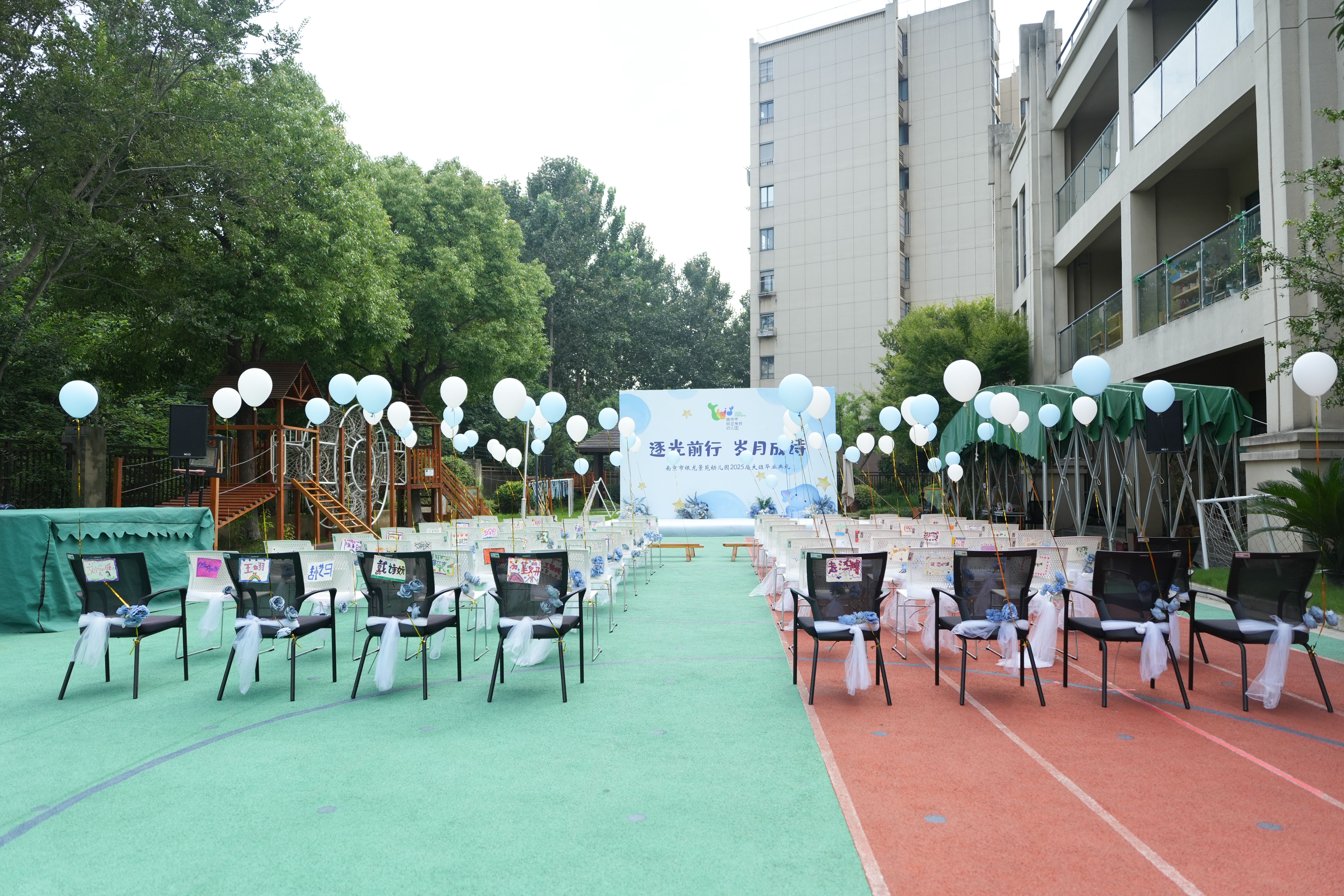 幼儿园内搭建拱形花门、签到墙,彩带、气球缠绕其上,宛如童话入口。场内,彩色气球柱错落有致,悬空的彩灯如繁星闪烁,每个座位都贴着孩子们精心准备的姓名作品,让家长和孩子们一进场就置身温馨艺术的空间。