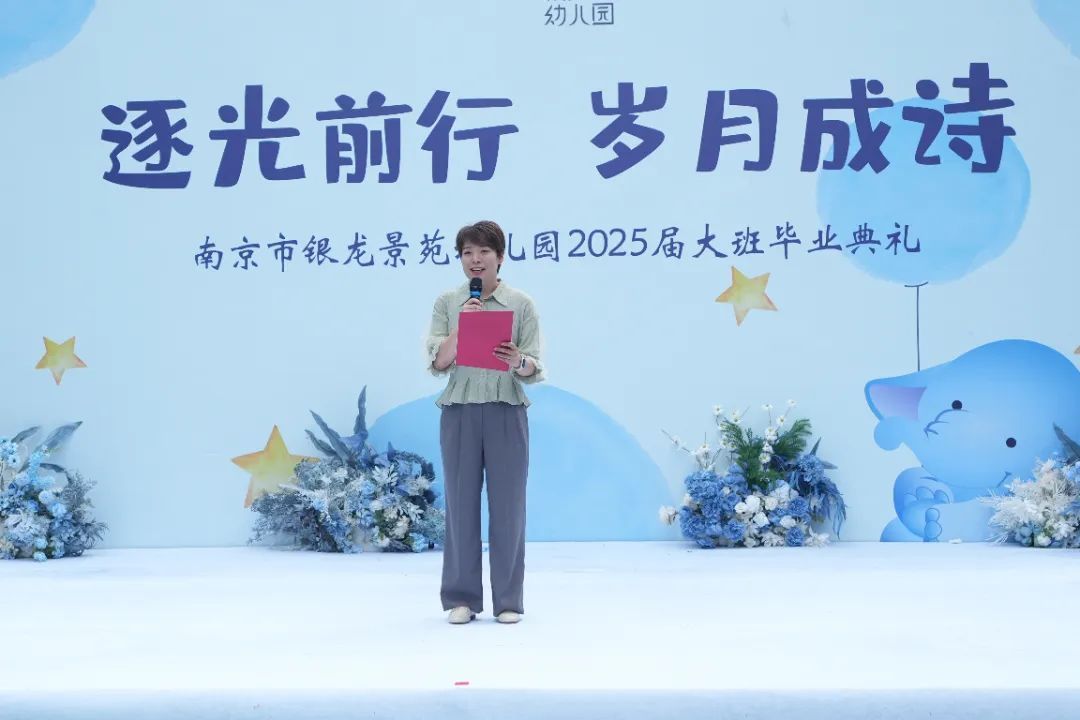 南京市银龙景苑幼儿园园长陈艳艳致辞饱含期许。她寄语孩子们背上成长行囊,拥有“好奇的眼睛”、“善良的温度”和“探索的勇气”奔赴下一段旅程。她的话语中既有 “未来或有风雨” 的坦诚,更有 “心中有梦想,脚下有力量” 的殷切期许,让现场家长与孩子在感动中汲取前行的力量。