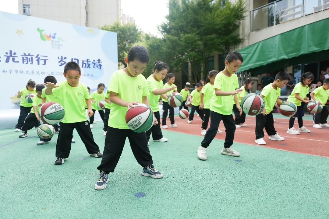 篮球在孩子们手中快速传递、灵动跳跃。整齐划一的拍球节奏,活力四射的运球动作,展现幼儿园生活里收获的运动风采与团队协作精神。