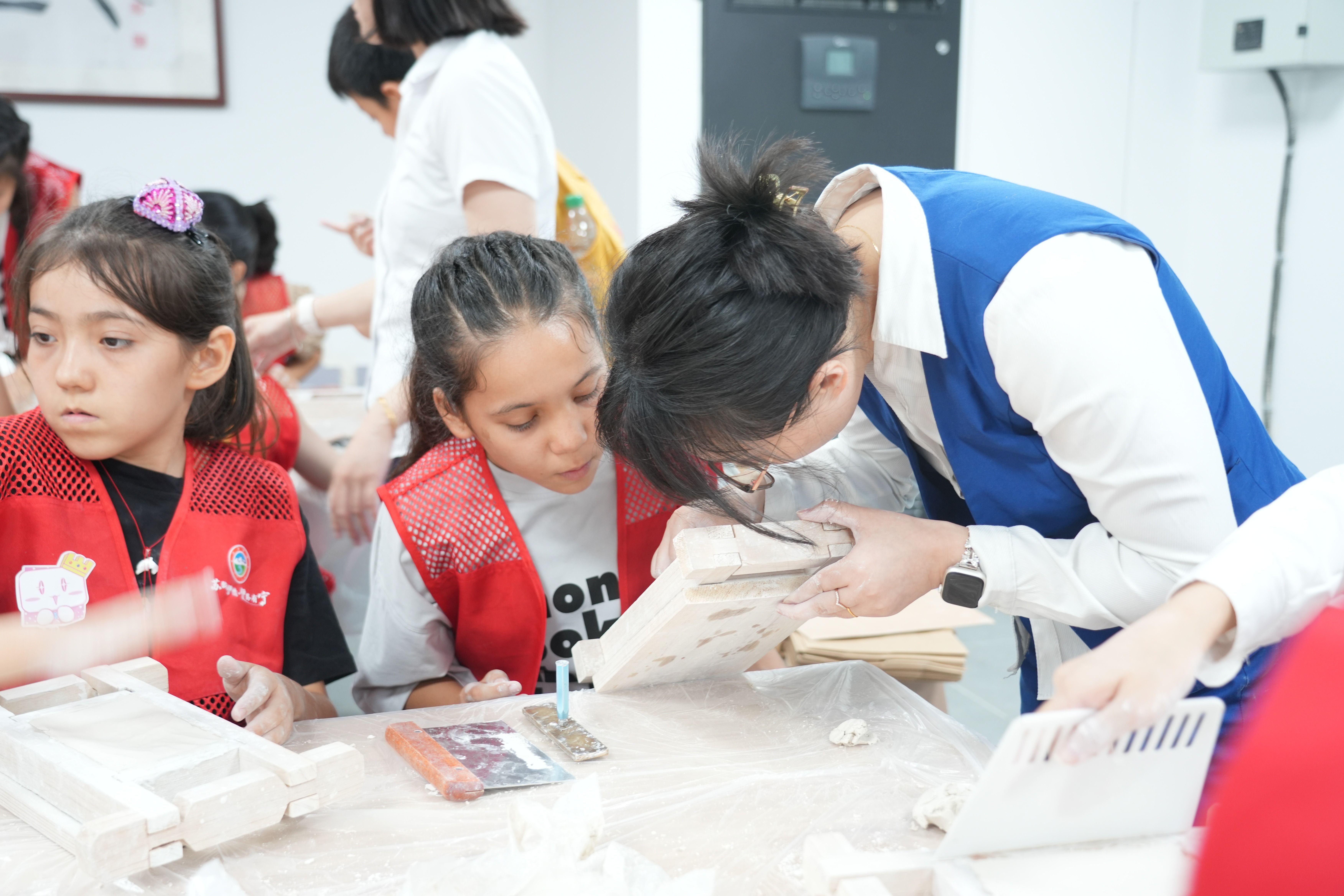 在城砖制作现场,宁伊两地的孩子们虽然是第一次接触城砖制作,但他们的热情丝毫不减。孩子们分好泥土后,将其塞进模具中,双手用力按压,让泥土填满模具的每一个角落,不留一丝空隙。过程中,两地的孩子们一起合作,用手掌反复拍打模具中的泥土,手下的泥土逐渐成形。虽然脸上沾到了泥土,但他们丝毫不在意,盯着眼前的城砖专注而认真。