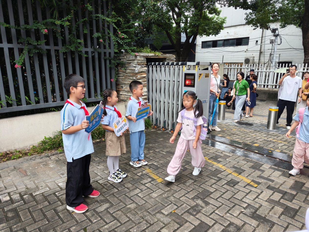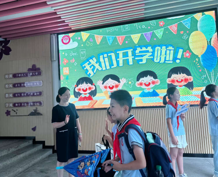 东方城校区的开学典礼则聚焦一年级新生的“入学第一课”,充满童趣与仪式感。清晨,校领导与二年级“小先生”们在校门口迎接新生,用亲切的问候消除孩子们的陌生感。