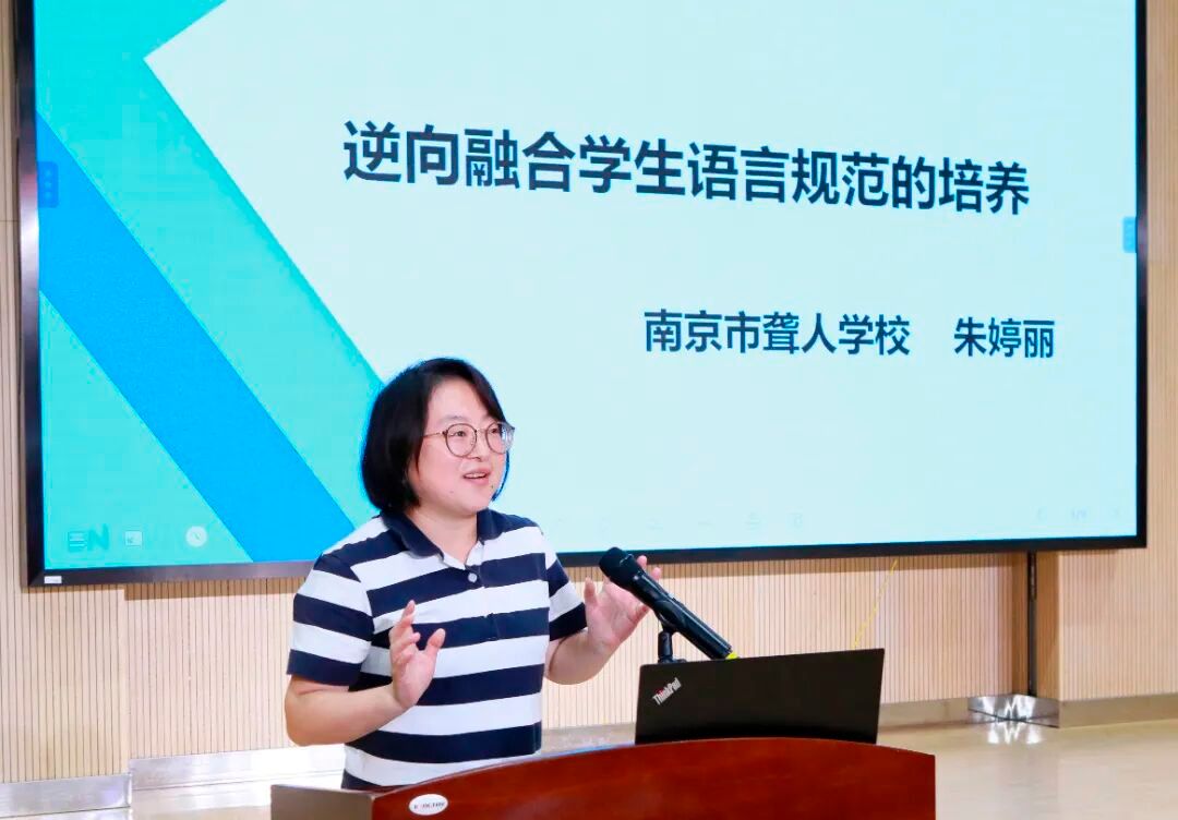 朱婷丽老师以《逆向融合学生语言规范的培养》为题做交流分享。朱婷丽老师首先明确了“逆向融合学生” 的关键特征界定,随后剖析该群体在言语发展中面临的具体困境,并针对性阐述语言规范的培养路径。朱老师强调,融合教育的核心在于平等交流与分享,她呼吁给予听障群体充分的试错机会,助力他们在适配自身的领域中实现人生价值。