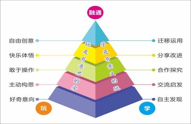 为了让“玩学融通”不流于形式,学校设计了“玩学融通”课堂学习金字塔模型。从“好奇意向”到“自由创意”,“玩”的每一步都对应着“学”的成长: