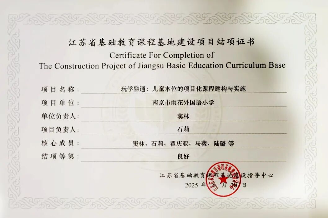 近日,南京市雨花外国语小学深耕多年的“玩学融通”项目化课程,在江苏省中小学课程基地与学校文化建设项目验收中顺利过关、圆满结项!